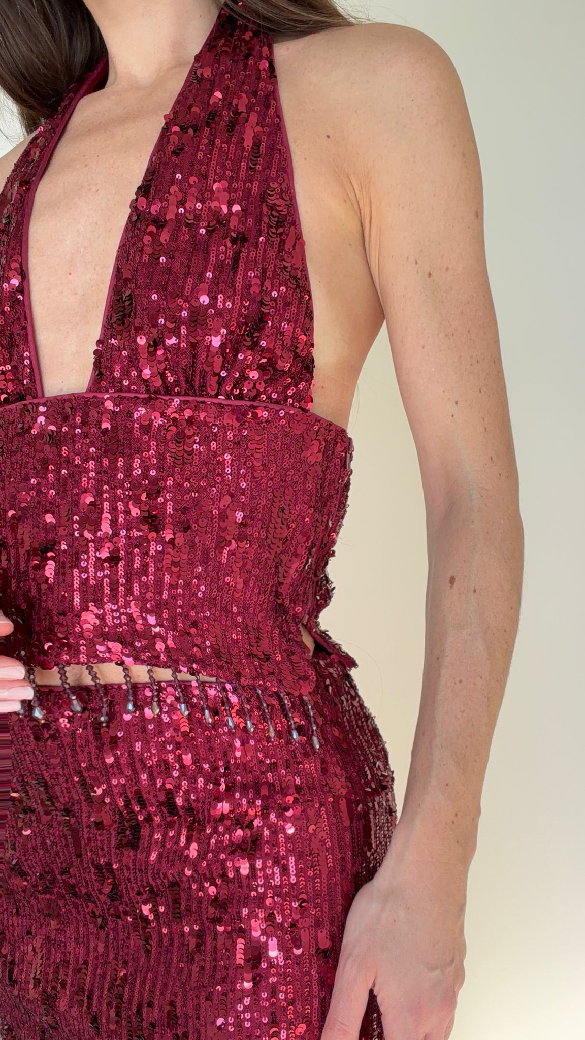 Feel confident in this dark wine sequin mid rise set. Team this fit with a pair of nude heels to elevate the look we are loving right now.